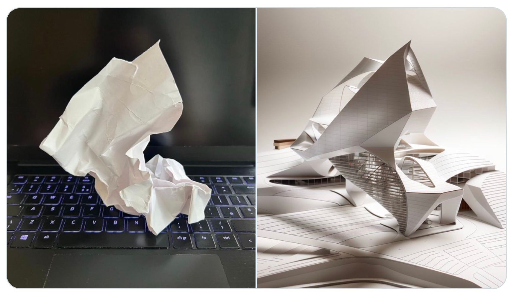 Generative AI continues to provide strange, unexpected and marvelous creations. Here we have a crumpled piece of paper reimagined as artful buildings by legendary architects. At least I just assume they are legendary, only one I actually recognize is Gehry.