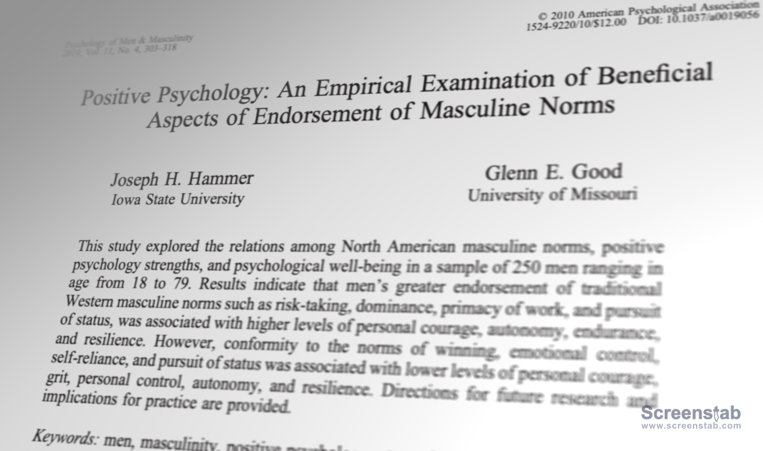 [3] Hammer, Joseph H.; Good, Glenn E. (2010). Positive psychology: An empirical examination of beneficial aspects of endorsement of masculine norms.. Psychology of Men & Masculinity, 11(4), 303–318. doi:10.1037/a0019056