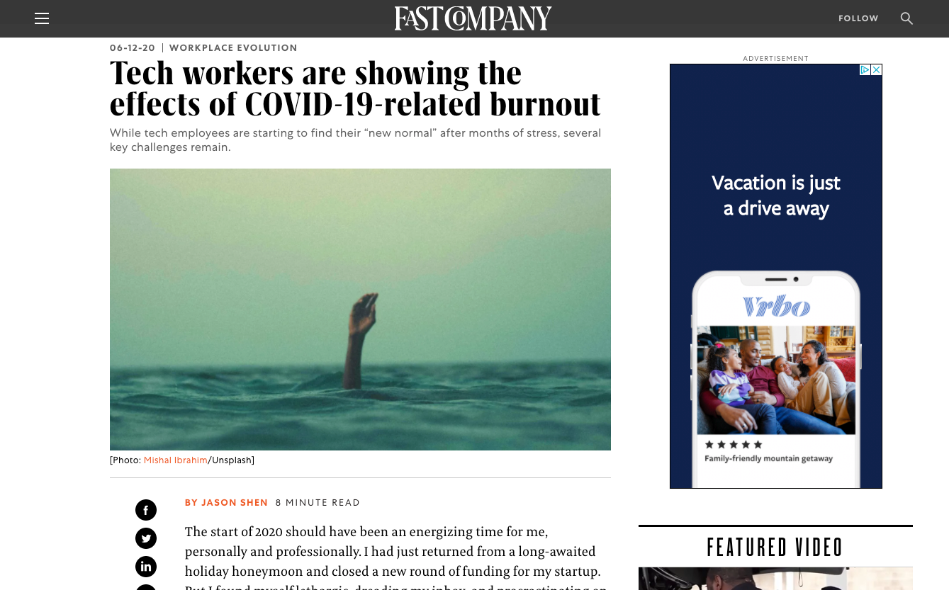 Have heard from a lot of folks who appreciated my piece in Fast Company on how tech workers are experiencing burnout in the face of the pandemic. I spoke to a number of folks including an exec coach for founders, a principal software engineer at Stitch Fix, and the researchers behind a survey of 100k+ tech workers.