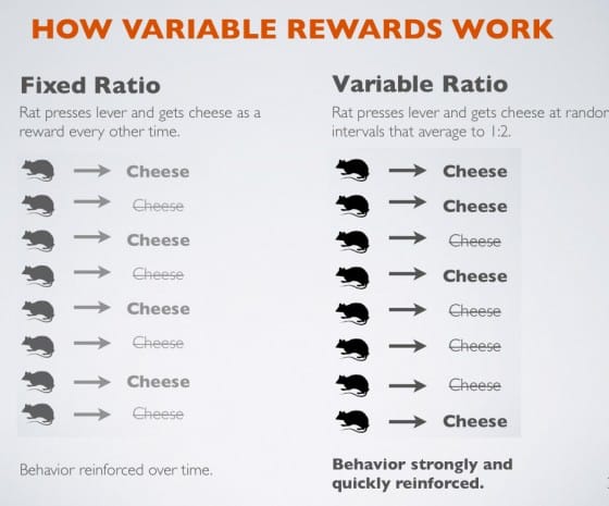 Variable rewards are when you positively reinforce a behavior at a non-fixed (ie less predictable) schedule. By varying when you deliver the reward for a certain behavior and how big that reward is, you can quickly reinforce that behavior and make it very strong and resistant to extinction (aka it becomes a habit or routine).