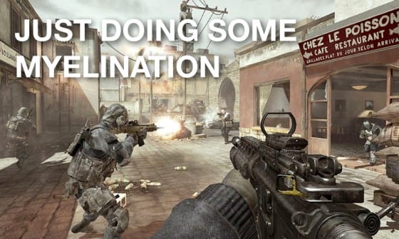 So as we practice, whether by writing new blog posts every week, hitting forehands at the courts or going for the headshot in Call of Duty, we trigger a pattern of electrical signals through our neurons. Over time, that triggers the glial cell duo to myelinate those axons, increasing the speed and strength of the signal. Like going from dial-up to broadband. This pattern of neurons travelling the s