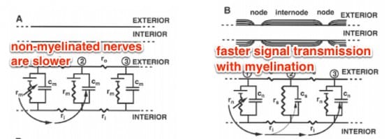 [2] “Myelin is a unique way to increase conduction speeds along axons of relatively small caliber … Myelinated nerves, regardless of their source, have in common a multilamellar membrane wrapping, and long myelinated segments interspersed with ‘nodal’ loci where the myelin terminates and the nerve impulse propagates along the axon by ‘saltatory’ conduction.” Rapid conduction and the evolution of giant axons and myelinated fibers.]