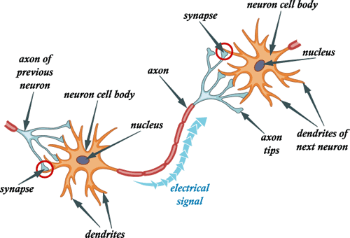 A little neuroscience 101 here: neurons are the basic cellular building blocks of the brain. A neuron is made up of dendrites, which receives signals from other neurons, the cell body, which processes those signals and the axon, a long “cable” that reaches out and interacts with other neuron’s dendrites. When different parts of the brain communicate and coordinate with each other, they send nerve impulses, which are electrical charges that travel down the axon of a neuron, eventually reaching the next neuron in the chain.