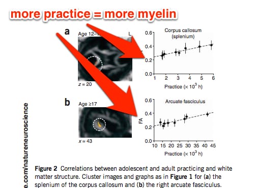 If you’re interested in learning more about myelin and skill acquisition, check out Daniel Coyle’s book The Talent Code and this Scientific American article “White Matter”